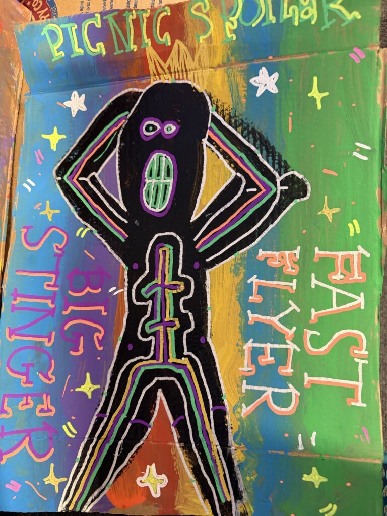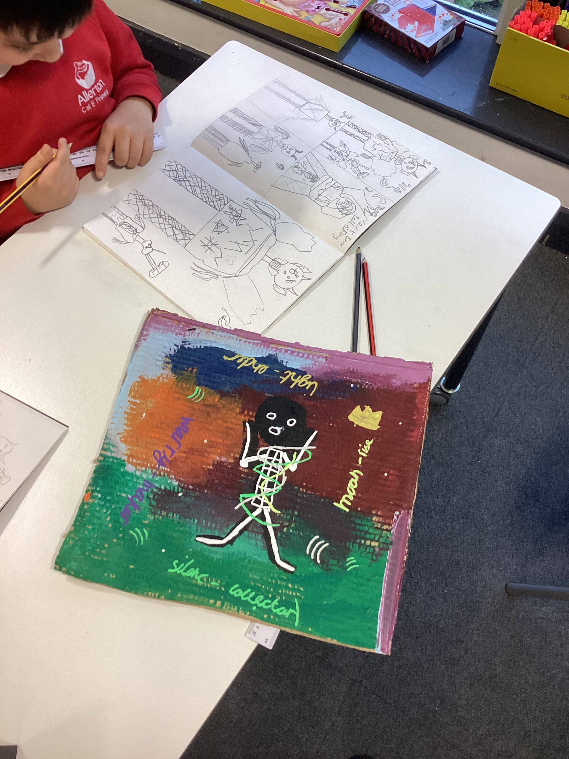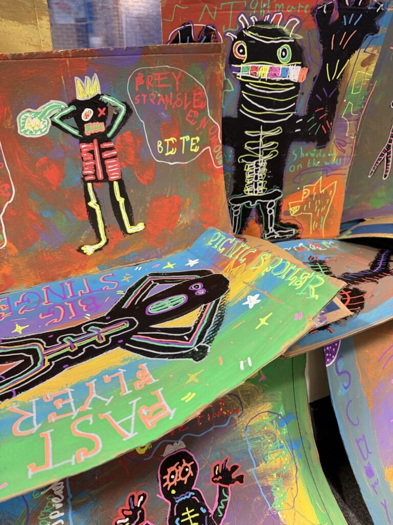 We are one step closer to finishing our final art design. Inspired by the style of Jean-Michel Basquiat, we painted our scared figures and added finer details using chalk pens. Our artwork represents our fears and how they make us feel and it uses the skill of Kennings to describe them.