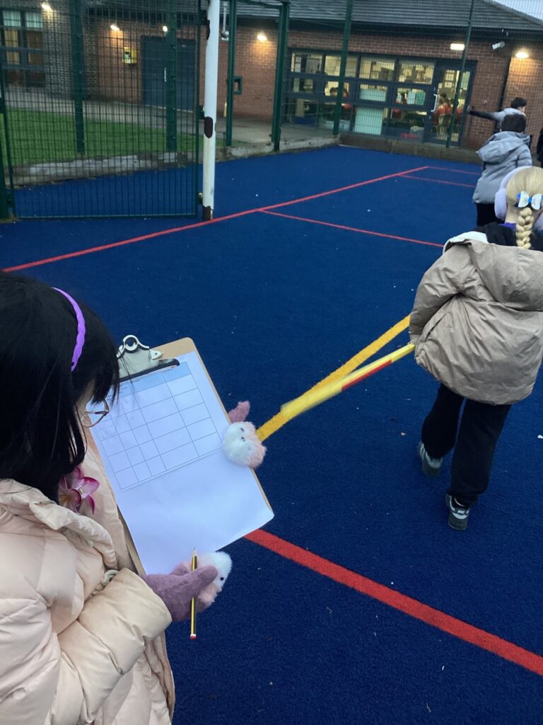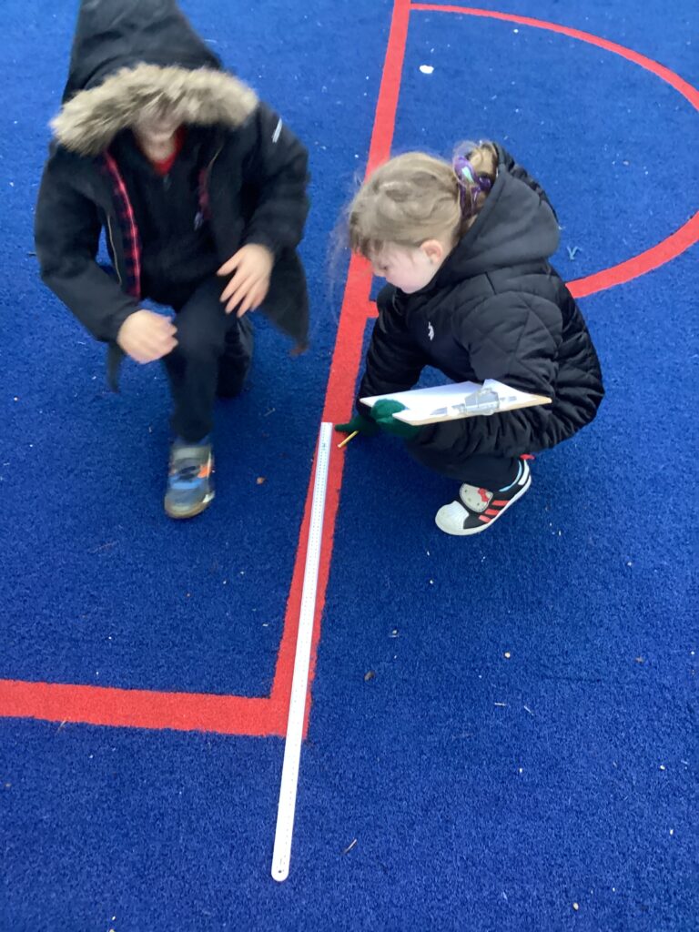 This week in Maths we have been learning all about perimeter and measurements. On Tuesday, we braved the cold to measure the length and width of the MUGA. to work out its perimeter. Take a look at us using real life skills to work out a maths problem!